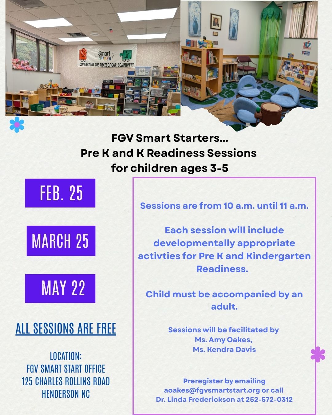 Join FGV Smart Start for Smart Starters Pre-K and Kindergarten Readiness Sessions for children ages 3 to 5. These free sessions will be held from 10:00 a.m. to 11:00 a.m. on February 25, March 25, and May 22 2026 at the FGV Smart Start Office, 125 Charles Rollins Road in Henderson. Each session includes developmentally appropriate activities to help prepare children for Pre-K and kindergarten, and children must be accompanied by an adult. Sessions will be facilitated by Ms. Amy Oakes and Ms. Kendra Davis.