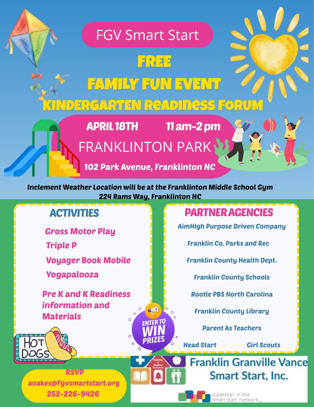 Join FGV Smart Start for a free Family Fun Event and Kindergarten Readiness Forum on April 18th, 2026 from 11:00 AM to 2:00 PM at Franklinton Park, 102 Park Avenue, Franklinton, NC. Families can enjoy gross motor play, Triple P, the Voyager Book Mobile, Yogapalooza, hot dogs, prize giveaways, and Pre-K and Kindergarten readiness information and materials.